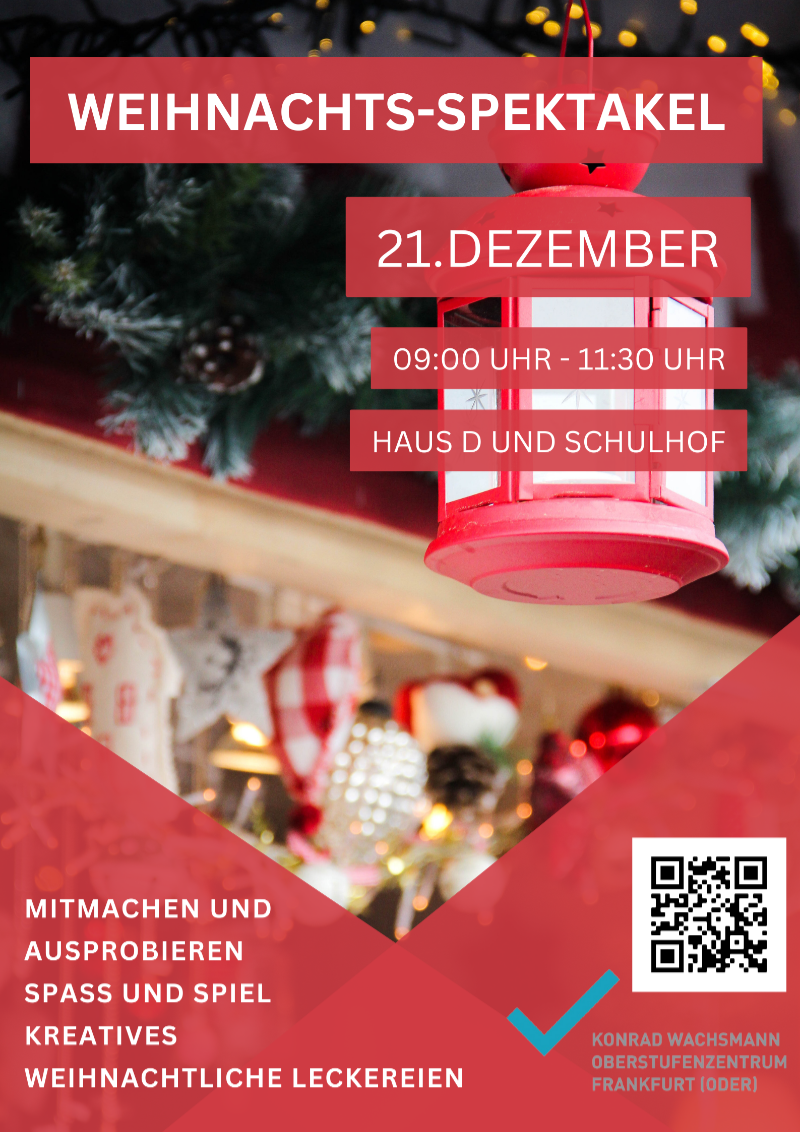 Am Mittwoch ist es wieder soweit, nach der Pandemiebedingten Pause findet wieder unser traditionelles Weihnachtsspektakel statt. Auf dem Schulhof des Haus D werden unsere Schüler*innen einen Weihnachtsmarkt mit leckeren Köstlichkeiten aufbauen. Im Haus wird der Weihnachtsmann unterwegs sein und für Fotos zur Verfügung stehen. Es wird ein vielfältiges Angebot an unterschiedlichen Stadtionen geben. Von kreativen Ideen wie Kartengestaltung, Weihnachtslichter herstellen oder unsere Töpferwerkstatt, bis hin zu sportlichen und spielerisches Aktivitäten. Auch das Weihnachtspostamt hat geöffnete und es können Grüße an alle Mitglieder der Schulgemeinschaft geschickt werden. Lassen wir den letzten Tag vor den Weihnachtsferien gemeinsam zu einem besinnlichen Tag werden. Vielleicht erklingt zum Abschuss noch ein kleines Weihnachtslied.